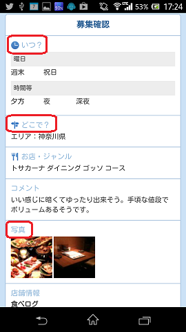 いつ、どこで、どんなお店・ジャンルでデートしたいのか細かく指定して募集ができます。コメント欄には意気込みを入力、食べたい料理の写真等を添付、行きたいお店の添付URLを入力して理想のデートスタイルを提案しましょう。